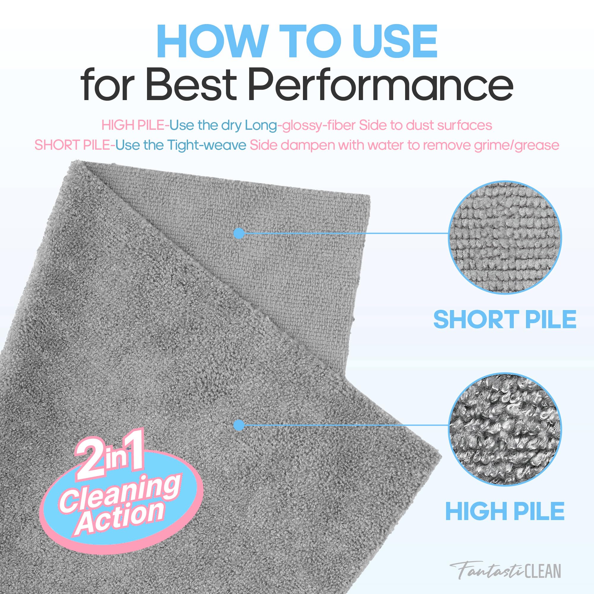 - [Powerful 2 in 1 Cleaning Action] Dual-sided 16” by 16” towel design, each features a long polyester fiber side that attracts dust like a magnet and a tight-weave side that easily wipes away grime, even without the need for additional chemicals
