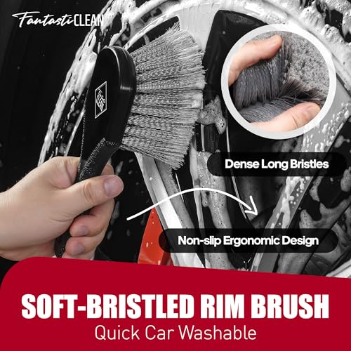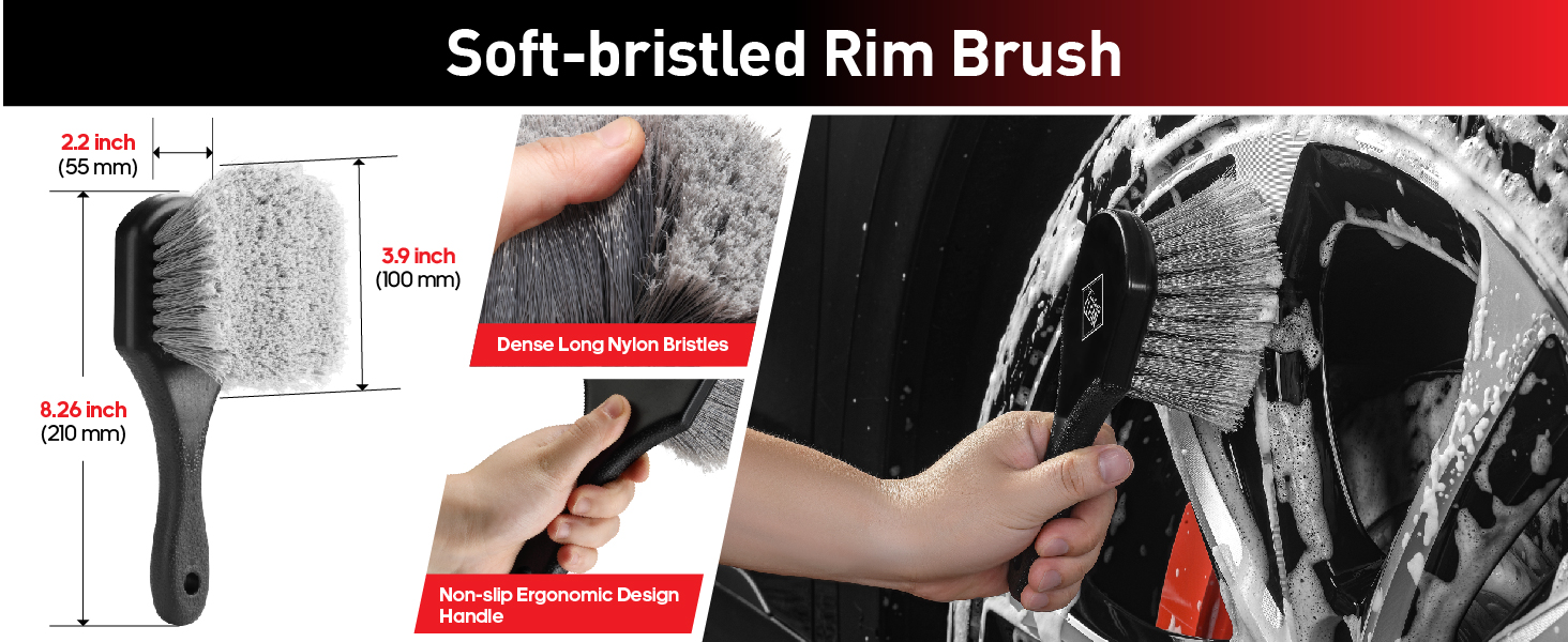 • SWIFT & SAFE WHEEL CLEANING: Our Soft-bristled Rim Brush lifts dirt and brake dust effortlessly. Its dense, long bristles combine effective scrubbing power with a scratch-free guarantee. The non-slip ergonomic design provides a secure, comfortable grip for perfect control, even when wet