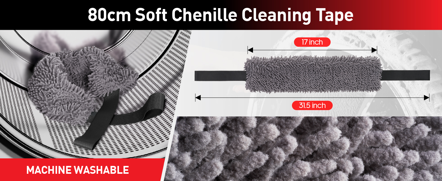 • ULTRA-SOFT & EFFECTIVE CLEANING: The 80cm Chenille Rim Cleaning Tape is the solution for hard-to-reach spots. Slide it through tight spaces, use the two loops for a secure grip, and let the premium material lift stubborn dirt with ease. It’s machine-washable for ultimate convenience